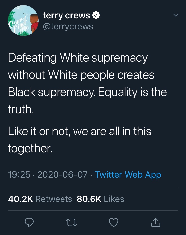 While they may exist, that doesn’t mean that Terry Crews was promoting them, or is one. If you read the post it actually equates black supremacy to white supremacy (which is obviously bad) and further suggests that the BLM movement needs white allies to avoid black supremacy.