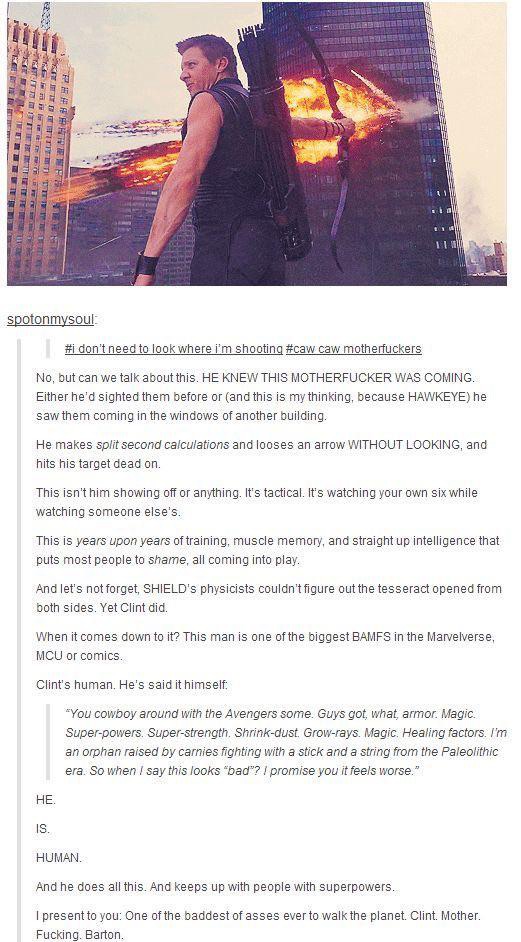 Unlike the other Avengers his time as a hero is taking a toll that you can see on screen, but he still continues to fight. His character has an underdog quality that appeals to me, and with the recent accident and injuries to Jeremy Renner even the ACTOR has us cheering him on.